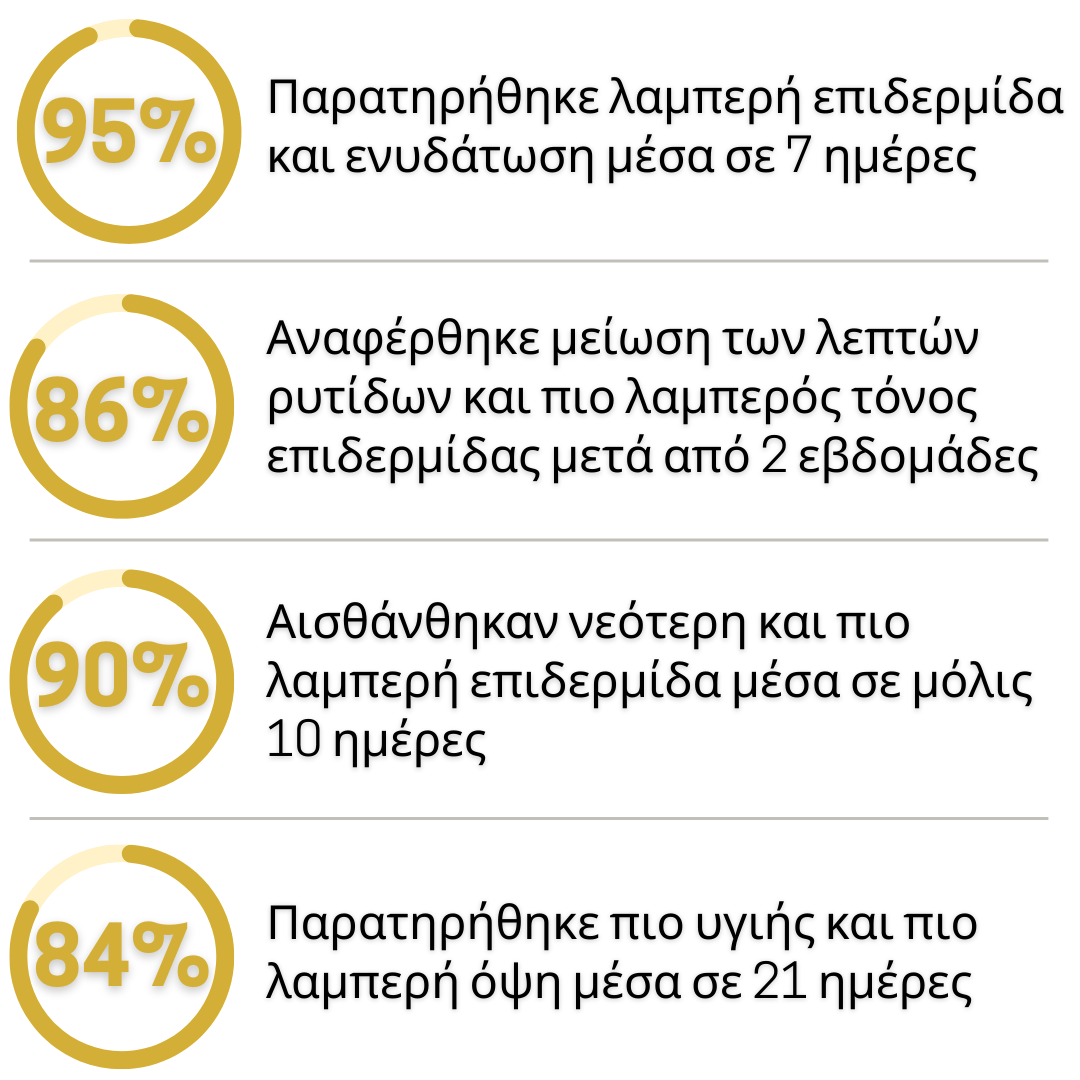 Πολλές πελάτισσες παρατηρούν βελτίωση στην ενυδάτωση και την υφή του δέρματος από την πρώτη εφαρμογή. Για πιο ορατά αποτελέσματα (μείωση των λεπτών γραμμών, πιο σφριγηλό δέρμα), συνιστάται η τακτική χρήση για 2 έως 4 εβδομάδες.